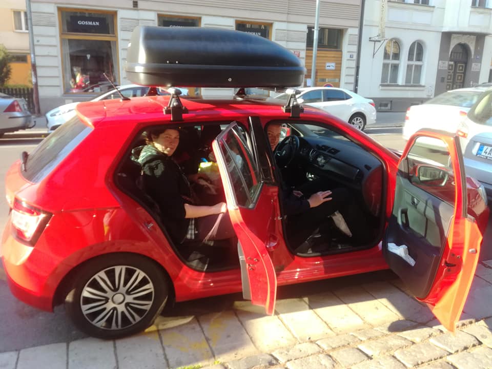 Jinak poklidné čtvrteční ráno, kdy všichni ještě spí nebo jsou dávno v práci jsme si takle s Mílou a Ivet hráli auto-tetris. Prostě jsme se snažili narvat tři psy, nás a věci na 5 dní do naší Rudé Sonji (čti Fabia pidimidi), abychom se byli schopni přepravit do 1100km vzdálené konečné destinace. Herní kolo level: supertetrismaster jsme dokončili úspěšně asi po půl hodině. Já jsem už vymýšlela čím přikreju Kiwinu jedoucí na střeše a Iveta se postupně loučila se všemi věcmi, které tam už prostě nenarvem. Kliďas Míla nakonec vše (s rozběhem) někam natlačil a vyrazilo se. Měl sice celou cestu kolena pod bradou, ale cosi o spoustě nepotřebných holčičích krámů, remcal jen prvních 100km.